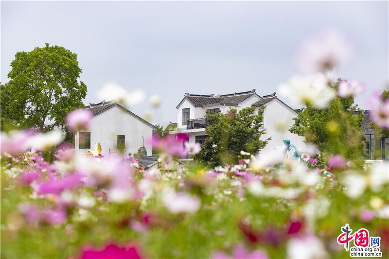 五彩缤纷的波斯菊蔚然成海,粉嫩的月见草温柔可人,爱心长廊环绕着的玫瑰娇艳欲滴,白墙黛瓦的香村掩映在花海深处。
