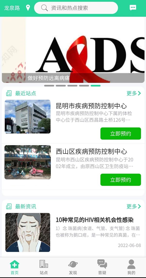 打开“晓艾”APP,首页上最近站点、最新资讯、一站式转介、热门问题答疑等功能十分齐全。该APP的核心内容版块“检测站点”提供站点分类、站点搜索、站点信息、站点联系、站点导航服务,便于用户通过平台进行预约检测、领取报告、咨询;同时上线的版块还有“检测预约”“检测报告”“消息通知”“发现”“在线答疑”“知识学习”等6部分内容。