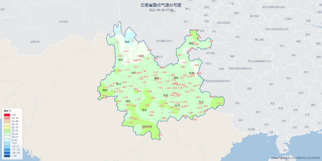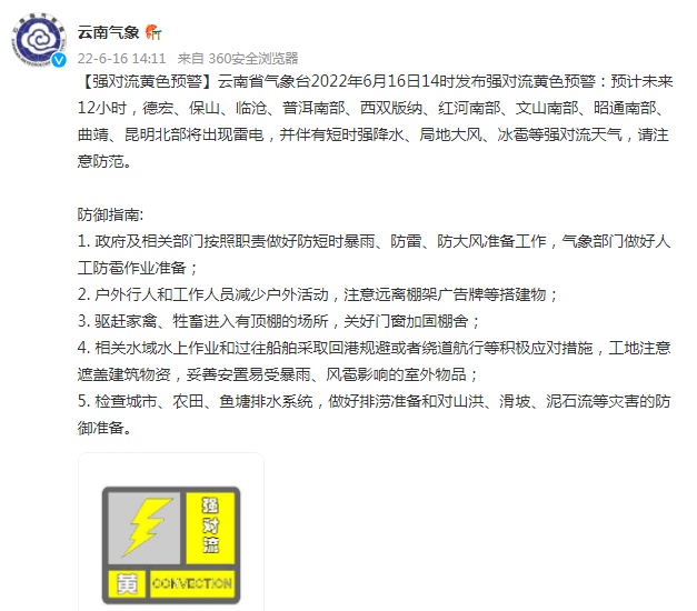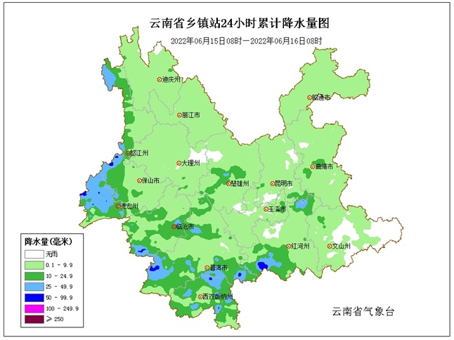其中,滇西南局部地区出现雷电及短时强降水天气,最大小时雨量42.2毫米(6月15日15时,景洪市光明电站)。