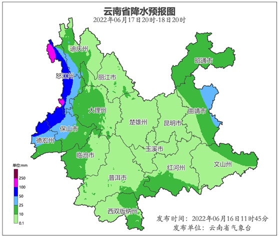 6月16日20时到6月17日20时:怒江、保山西部、德宏阴有大雨局部暴雨、大暴雨,迪庆西部、大理西部、保山东部、临沧西部、普洱南部、西双版纳、红河南部、昭通南部、曲靖东北部阴天间多云有小到中雨,其他地区多云局部有阵雨。