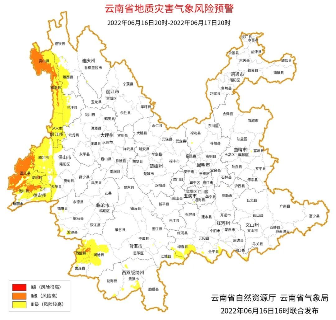地质灾害方面,预计6月16日20:00~6月17日20:00,迪庆州西部、怒江州大部、德宏州大部、保山市西部、普洱市西部和东南部、西双版纳州中部、红河州南部地质灾害气象风险等级为Ⅲ级(风险较高),其中怒江州北部、德宏州中西部、保山市西部、普洱市西南部地区地质灾害气象风险等级为Ⅱ级(风险高)。