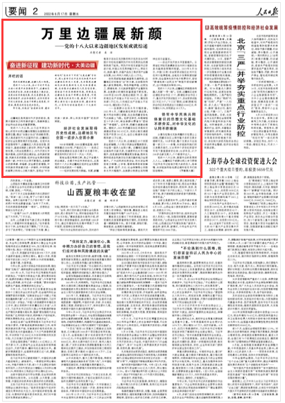 6月17日,《人民日报》聚焦党的十八大以来边疆地区加快发展的巨大变化和显著成绩,作为我国面向南亚东南亚辐射中心,云南也在镜头扫描之列。相关报道展示了中国(云南)自由贸易试验区红河片区的制度创新成就和西双版纳傣族自治州为筑牢边境疫情防控网所作的努力,为云南沿边开发开放和强边固防工作点赞。