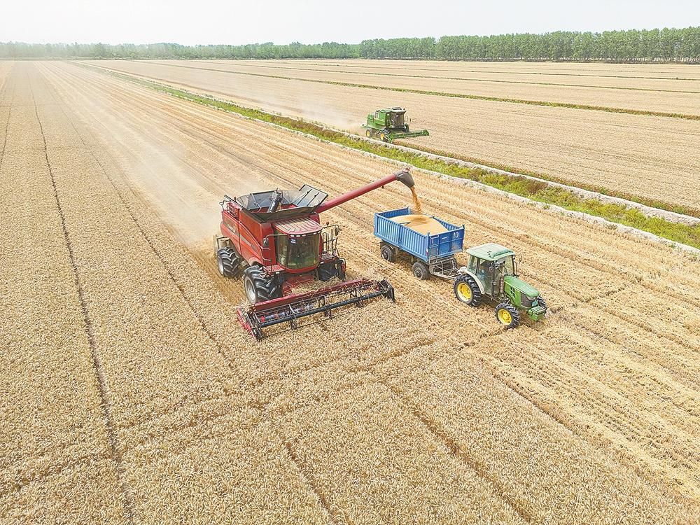 6月10日,在江苏省方强种子有限责任公司的万亩繁种基地,十几台收割机正在紧张作业,抢抓晴好天气收割小麦。另一边,已经平整好的水田里,工人们正在忙着搬运秧盘,插秧机将一行行绿油油的秧苗栽插在田里。