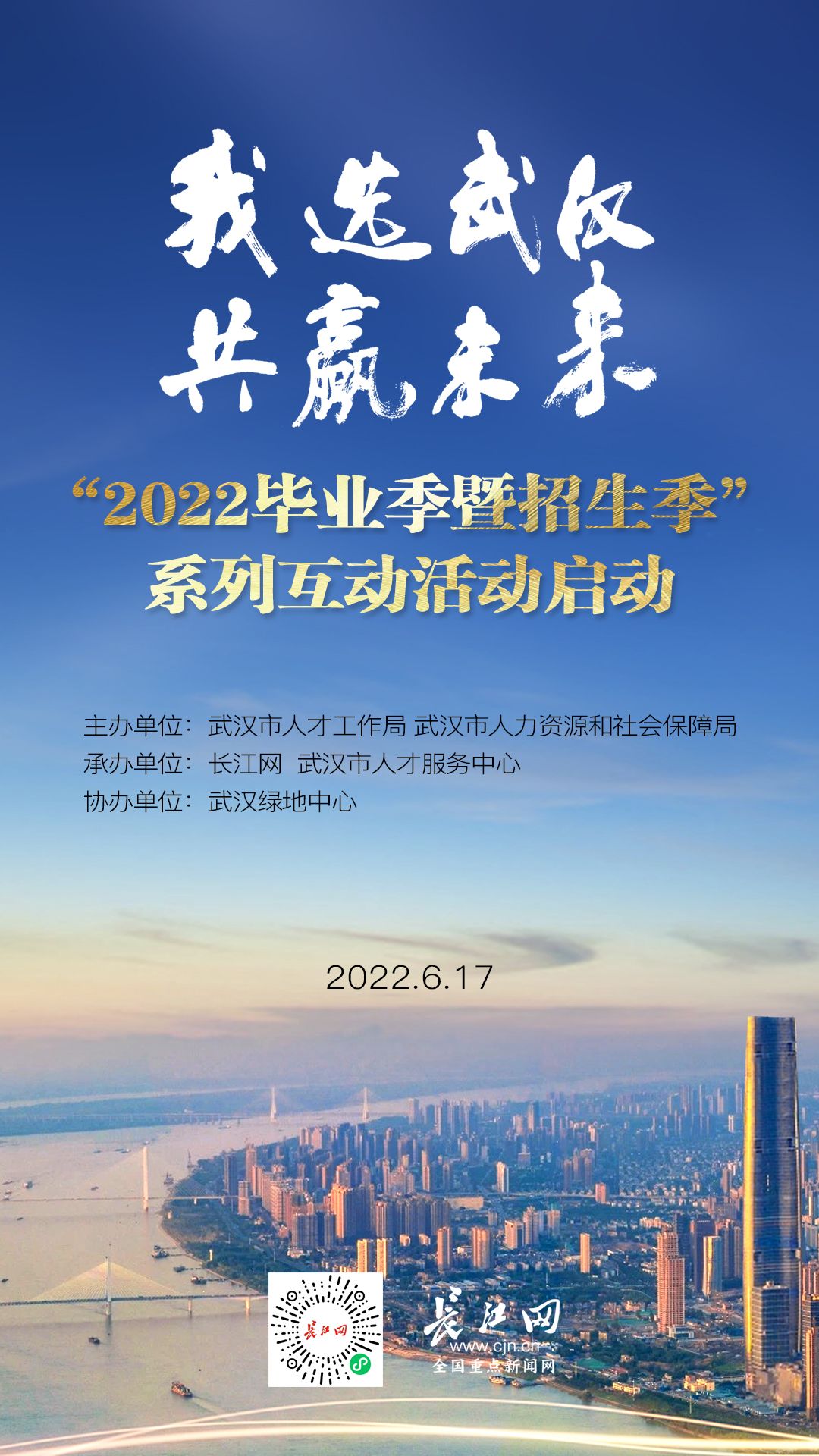 “我选武汉 共赢未来”2022毕业季暨招生季系列互动活动由武汉市人才工作局、武汉市人力资源和社会保障局主办,长江网和武汉市人才服务中心承办,武汉绿地中心协办,包括“发布招聘岗位”促大学生留汉就业创业系列活动、“打卡城市地标 提升武汉新形象”毕业季系列活动、“长江会客厅”高招问答系列访谈三大板块,时间持续到今年8月。