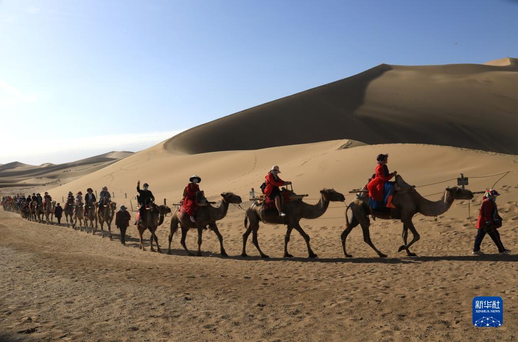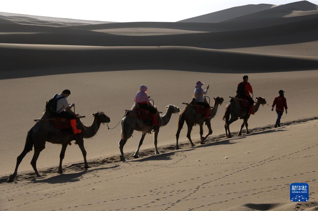 6月19日,游客在甘肃省敦煌市鸣沙山月牙泉景区骑骆驼游览。