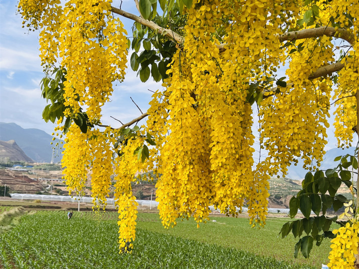 近年来,云南省丽江市永胜县涛源镇引进了黄金雨树作为行道、广场的绿化树种,在全镇范围内进行种植。入夏以来,上千棵黄金雨花盛开在当地形成了一道靓丽的风景,吸引了十里八乡群众前来驻足观赏。