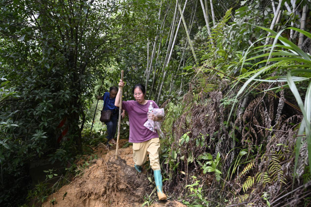 脚穿水鞋、头戴草帽、手握竹竿拐杖