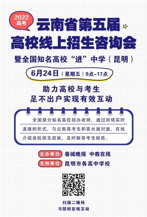 6月24日(星期五),由春城晚报、中教在线联合主办的公益品牌活动——2022年云南省第五届高校招生咨询会(线上)暨全国部分知名高校“进”中学(昆明),将如期与考生和家长见面,为考生和家长第一时间提供最精准的高考志愿填报指南,搭建高校与考生之间相互沟通的桥梁,助力考生选择最适合自己的学校和专业。