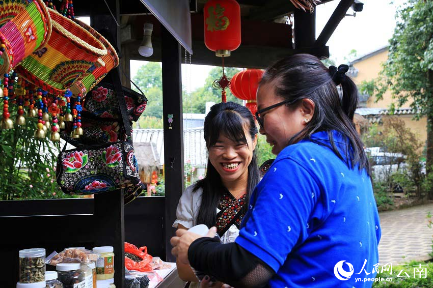 赵仁芹(左)热情地向游客介绍着自家的特色农产品。人民网 刘怡摄