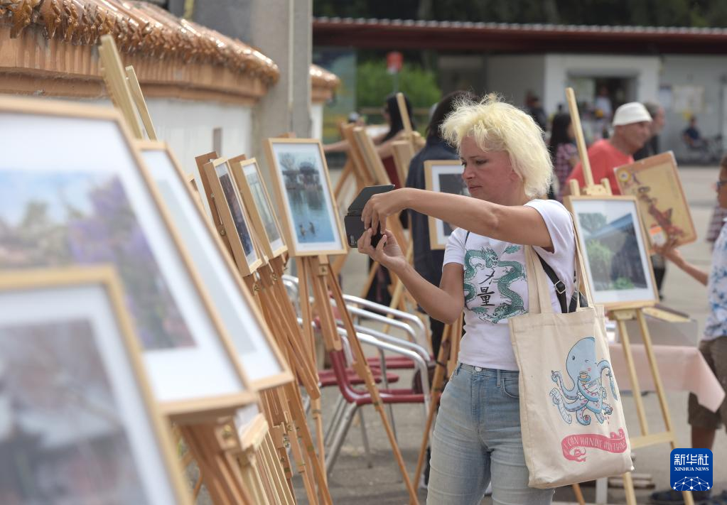 6月22日,在奥地利维也纳,当地市民在维也纳艺术节“奥地利中国日”活动上观看中国园林摄影展。
