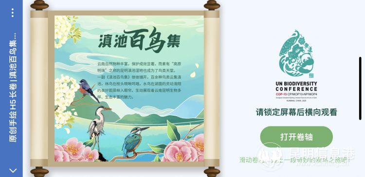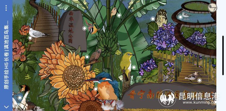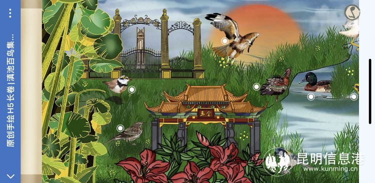 “滇池百鸟集”H5长卷由昆明学院美术与艺术设计学院鸟绘花影团队手绘打造,昆明信息港提供技术支持,以胜利堂、金马碧鸡坊、大观楼、西山龙门等昆明地标性建筑以及西华、捞鱼河、海东等滇池周边湿地公园为背景,百种可在云南可观测到的特色鸟类环绕其中,全景展现了滇池水清岸绿、鸟儿自由憩息、人与自然和谐共生的美好图景。