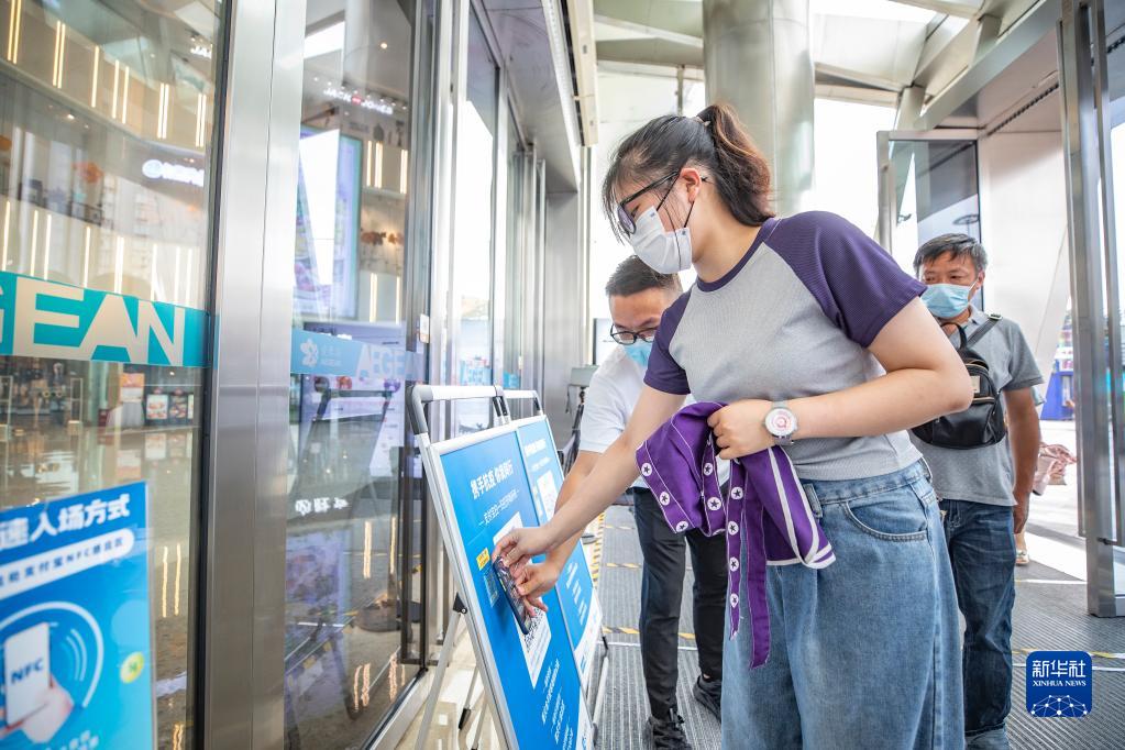 7月4日,在重庆两江新区一购物公园内,顾客使用NFC功能完成入场登记。新华社 记者黄伟摄