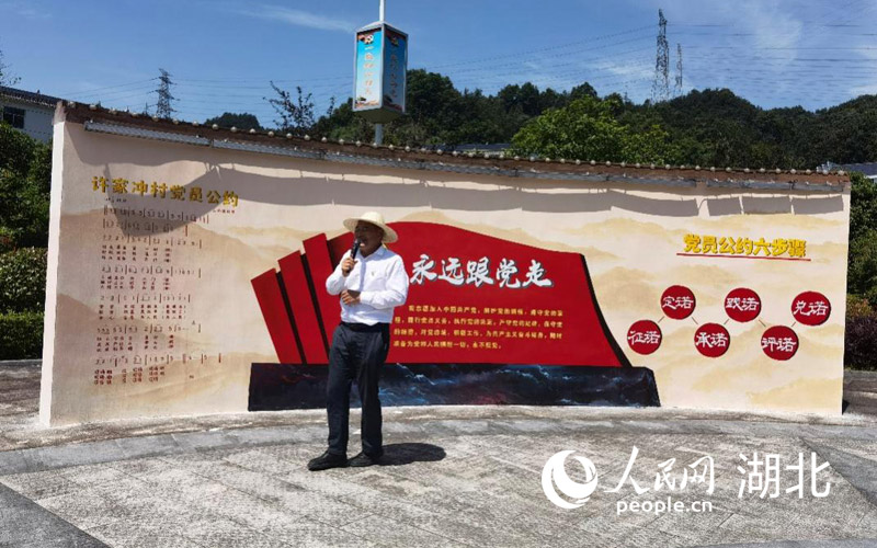 许家冲村党支部书记望作战吟唱《党员公约》。人民网 张隽摄