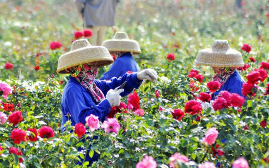 村民在玫瑰谷修剪玫瑰花。受访者供图