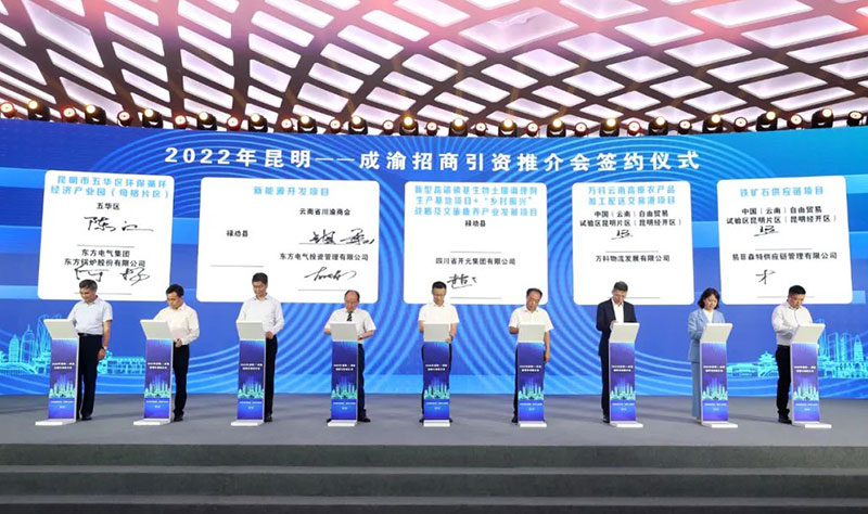 在昆明—成渝招商引资推介会上,签约的35个项目中,除4个100亿元及以上的项目外,还有4个50亿元至100亿元的项目,9个10亿元至50亿元的项目。新签约项目中,既有生态涵养、特色农旅“两手抓”的特色项目,也有因地制宜的生态环保类项目。