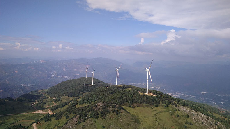 从昆明驱车朝富民县大风丫口村方向前进,一路上山路曲折蜿蜒,伴随着“呼呼”入耳的风声,大风丫口风电场高耸入云的白色风车清晰可见。