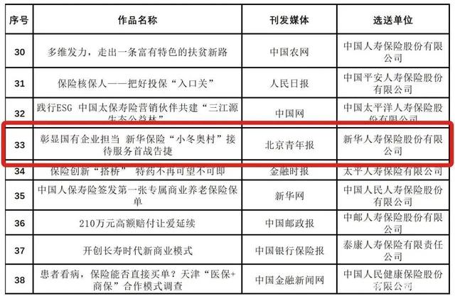 新华人寿保险股份有限公司2021年10月发布的新闻《彰显国有企业担当 新华保险“小冬奥村”接待服务首战告捷》荣登“中国保险业2021年度好新闻”。