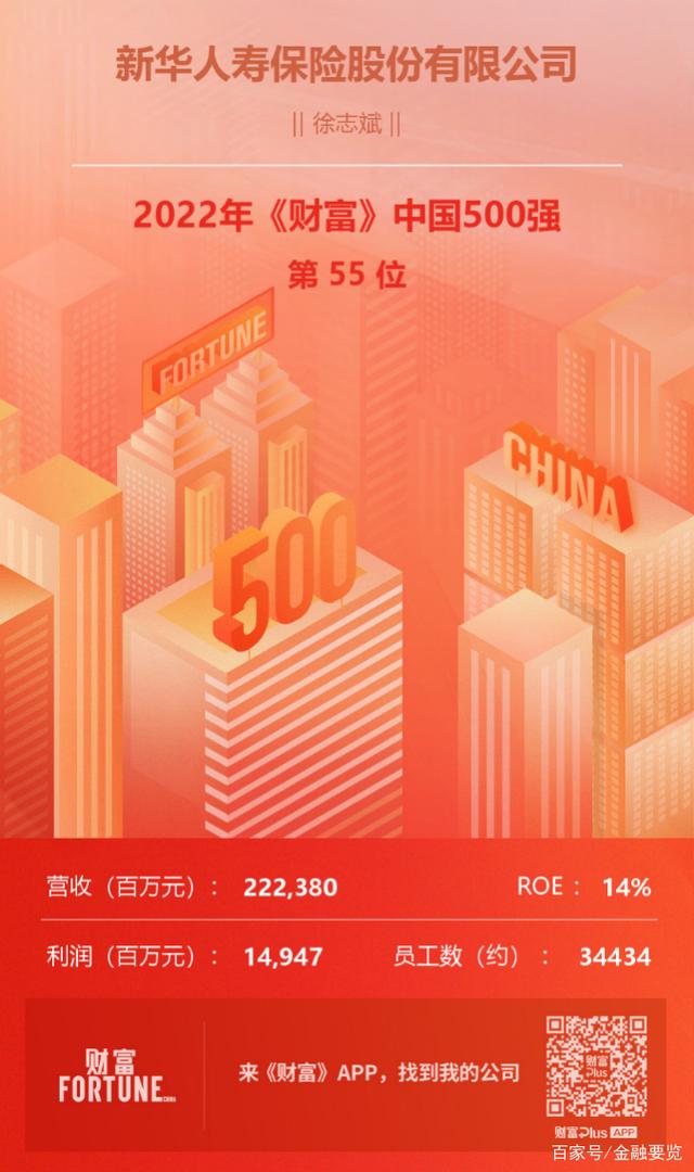 7月12日,财富中文网2022年《财富》中国500强排行榜发布。新华保险连续11年入榜,排名第55位。榜单期内显示,新华保险2021年营业收入达2,223.8亿元。