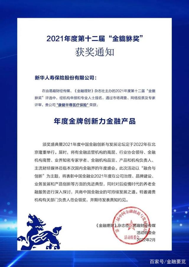 2月,在易趣财经传媒、《金融理财》杂志社主办的第十二届“金貔貅奖”金牌榜上,新华保险康健华贵医疗保险荣获“年度金牌创新力金融产品”奖项。