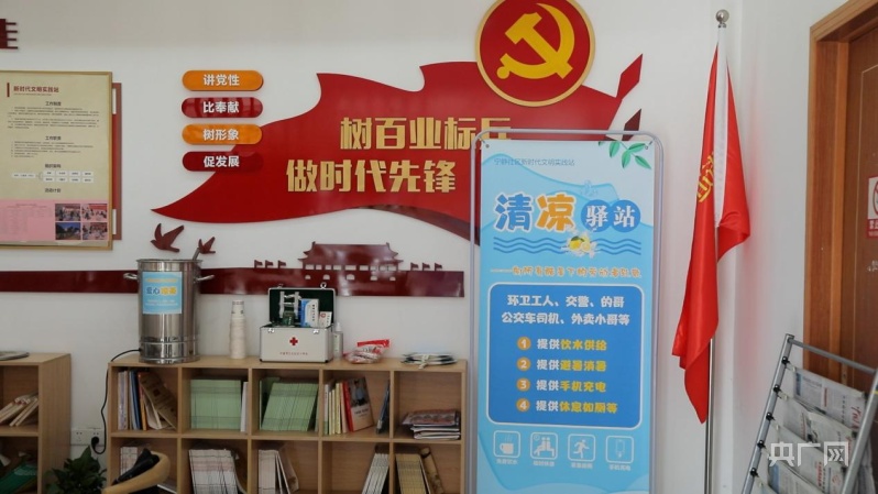 近日,甬城持续晴热高温,日均最高气温近40℃,为保障户外工作者在高温下也能有舒适的休憩场所,江北区洪塘街道组织开展了“夏日送清凉”主题志愿活动,“我们在辖区22个村、社区的新时代文明实践站全面开设‘清凉驿站’,做大做强新时代文明实践站主阵地功能,将文明志愿的清凉之风送到洪塘全域的各个角落。”洪塘街道党工委委员周昀毅向记者介绍,每个实践站内设有志愿者岗位,他们会为上门纳凉的户外工作者提供最贴心的服务,让大家“冒着暑气来,带着清凉归”。
