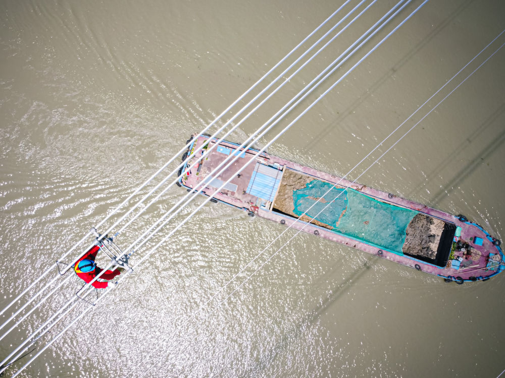 7月12日,吴国伟正在进行跨大运河走线验收工作(无人机照片)。新华社记者 江汉 摄