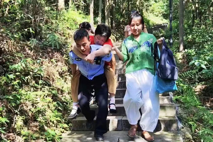7月10日,王国壮背着老人下山。(常山县公安局供图)