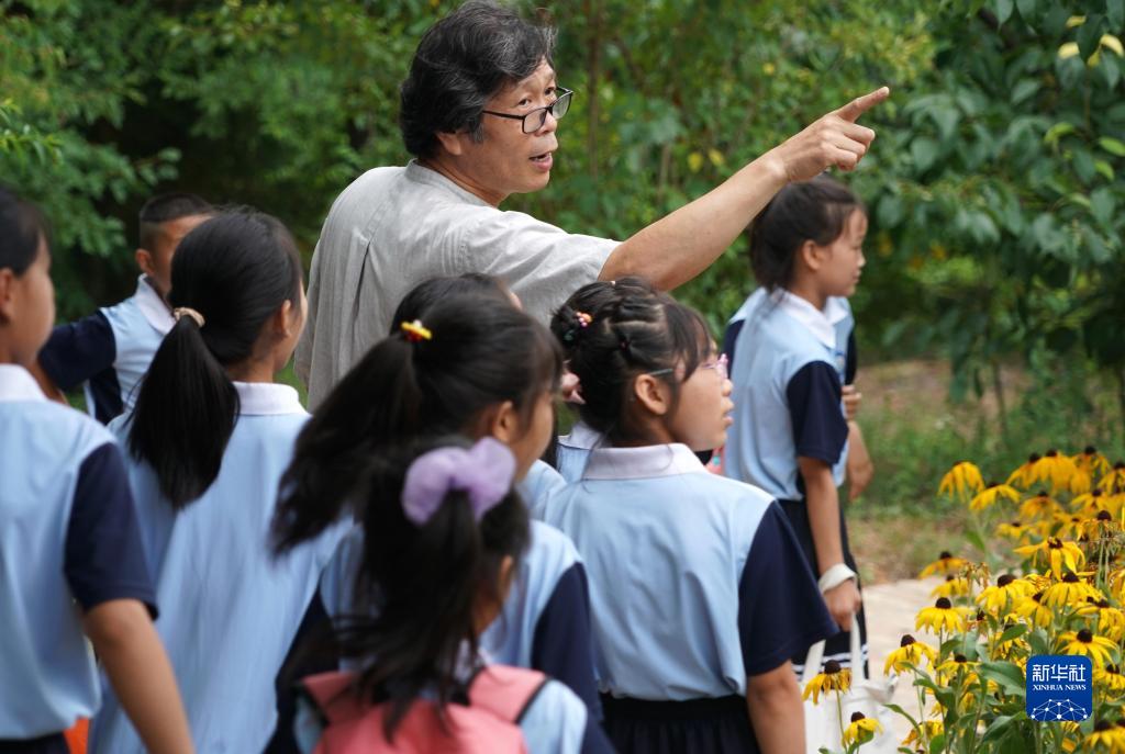 在“洛阳三彩陶艺村”,郭爱和带领罗岭乡中心小学的学生写生(7月12日摄)。新华社记者 李安 摄