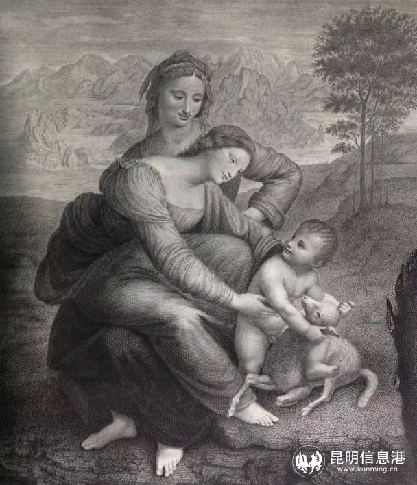 达芬奇《圣母、圣婴和圣安娜》铜版画——1810卢浮宫出品