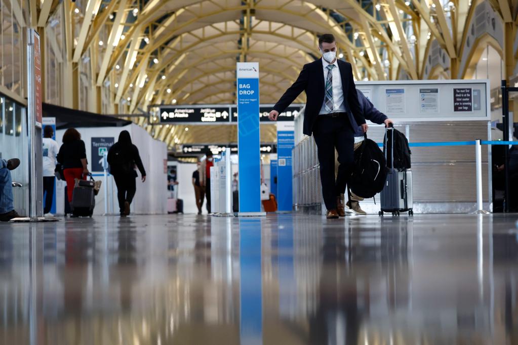 4月14日,在美国弗吉尼亚州阿灵顿的里根国家机场,旅客戴着口罩走在航站楼里。新华社发(沈霆/摄)
