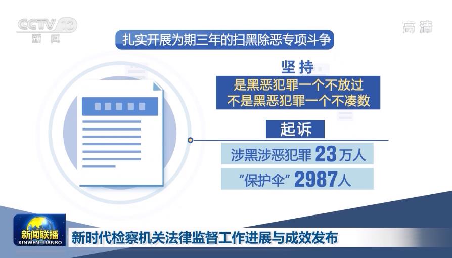 检察机关坚持总体国家安全观,依法惩治各类刑事犯罪。扎实开展为期三年的扫黑除恶斗争,坚持“是黑恶犯罪一个不放过、不是黑恶犯罪一个不凑数”,起诉涉黑涉恶犯罪23万人、“保护伞”2987人。