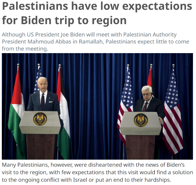 虽然此访期间,拜登与巴勒斯坦总统阿巴斯举行了会谈并表示支持两国方案,但并未采取任何实际行动纠正特朗普政府的“偏以”政策。