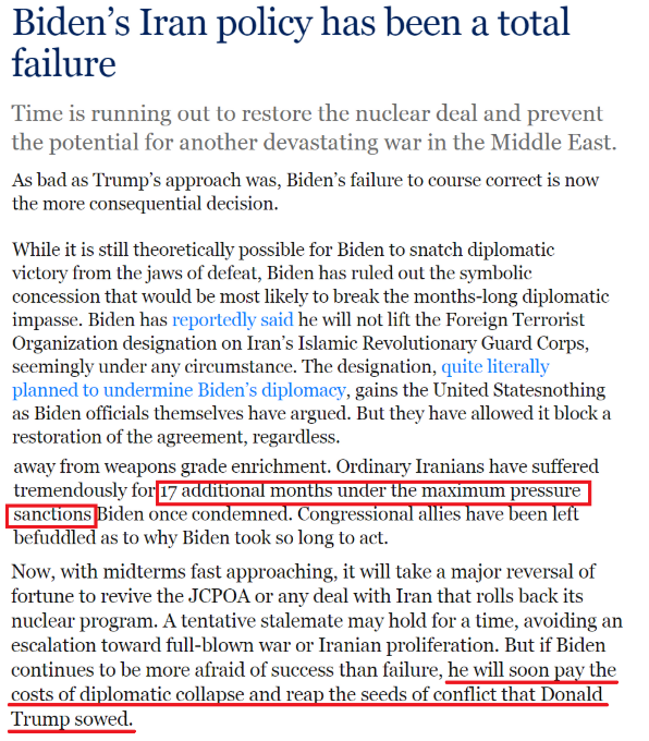 文章说,拜登本来有机会果断告别前任的失败做法,并表明华盛顿认真履行其国际承诺,但他却迟迟无所作为。相反,在他曾经谴责的特朗普式极限施压制裁下,伊朗民众又遭受了17个月(拜登上台至今的时间)的巨大痛苦。