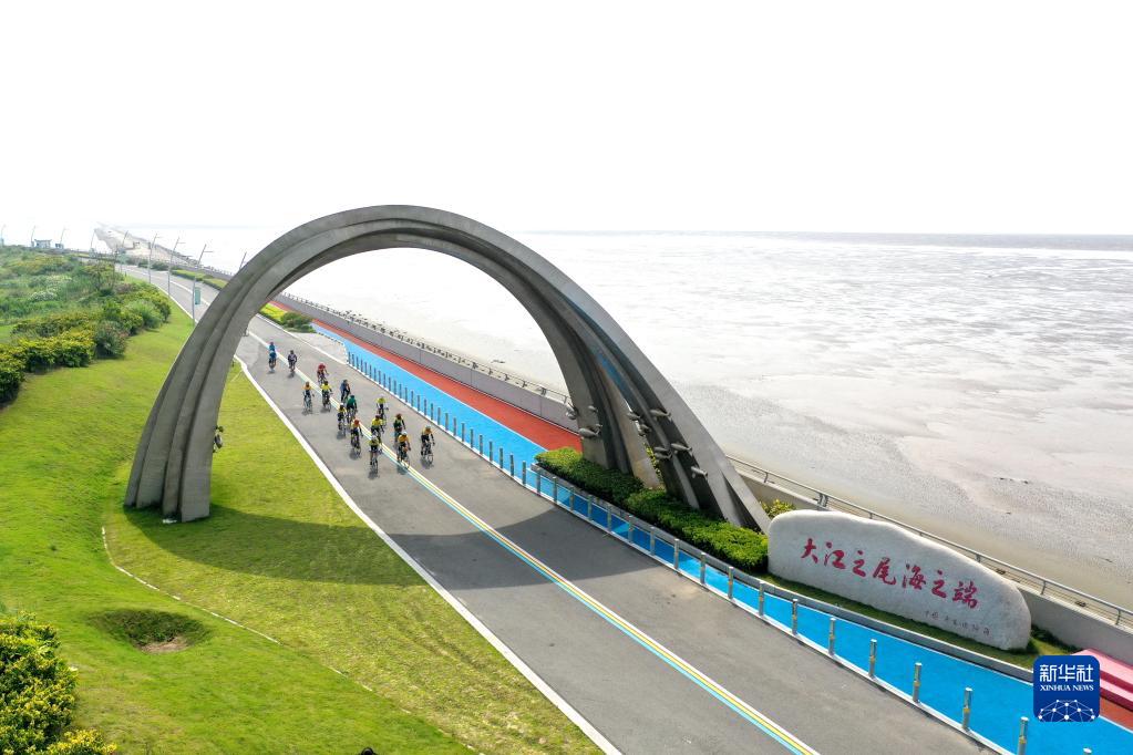 游人在江苏省启东市江海文化景观大道骑行(2022年7月17日摄,无人机照片)。新华社记者 季春鹏 摄