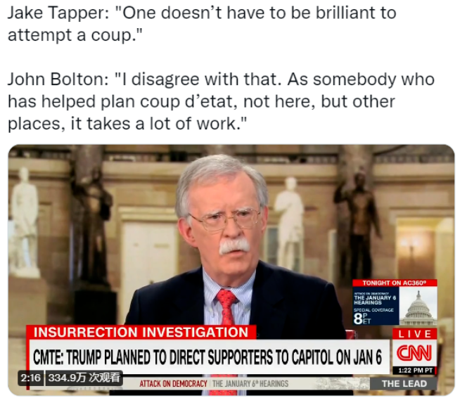 美国有线电视新闻网(CNN):当CNN主持人塔珀说“一个人不需要很聪明就能尝试发动政变”时,博尔顿反驳称:“我不同意这种说法。作为一个曾经帮助策划政变的人——不是在美国,而是在其他地方——我知道这需要做大量工作。”