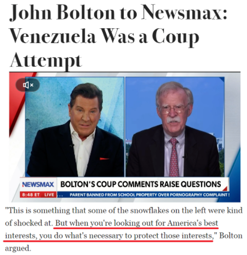 博尔顿接受美国右翼媒体“Newsmax”采访时,为他承认曾帮助策划他国政变的言论辩护称,“为了美国的最大利益,这是该做的”。