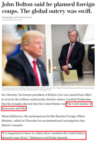 俄罗斯外交部发言人扎哈罗娃则呼吁对博尔顿的言论进行国际调查,“我们要知道美国还在世界其他哪些地方策划了政变”。