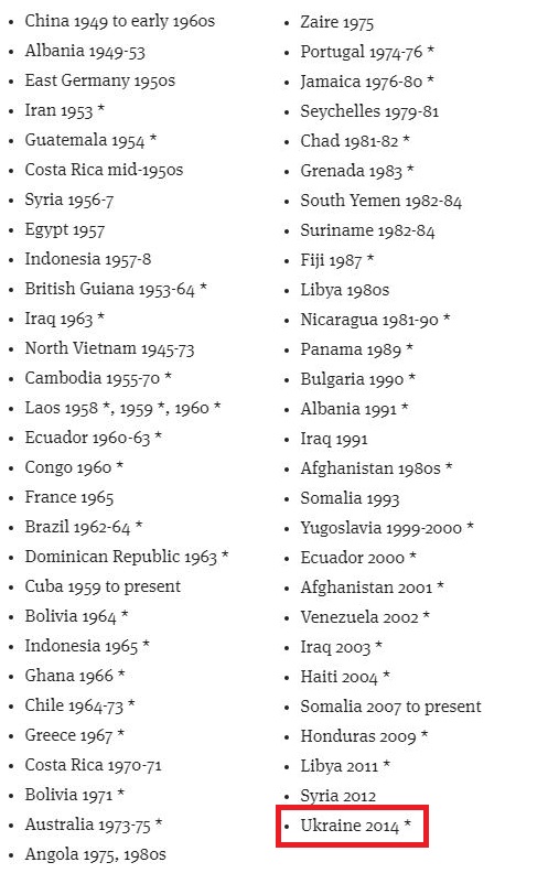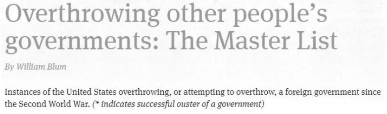 据威廉·布鲁姆生前统计,自二战结束到2014年乌克兰发生“颜色革命”,美国曾经推翻或企图推翻的外国政府至少有57个。