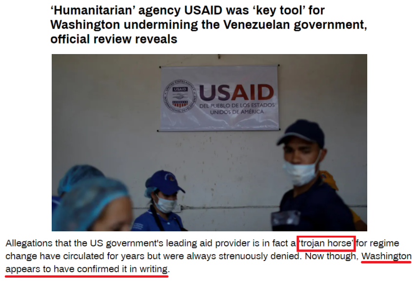 根据“今日俄罗斯”电视台的解读,这份报告清楚地表明,USAID如同“特洛伊木马”,在美国干涉委内瑞拉内政方面发挥了“关键作用”。