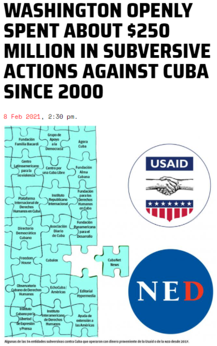据拉美媒体揭露,在过去20年间,NED和USAID沆瀣一气,自2000年以来针对古巴投入约2.5亿美元,煽动当地民众参加所谓“社会运动”。
