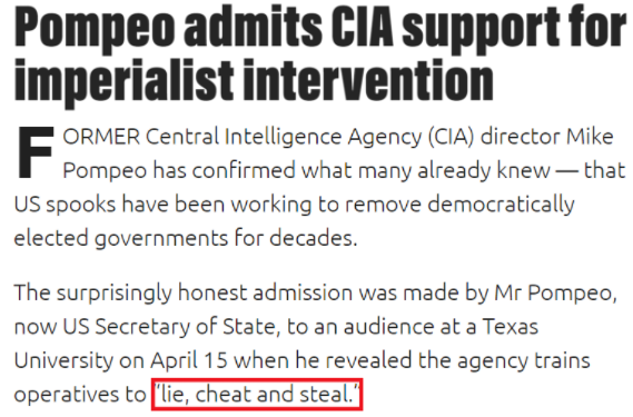 至于中情局(CIA)的角色,曾做过中情局局长的前美国“史上最差”国务卿蓬佩奥已经说得很清楚:“我们撒谎、我们欺骗、我们偷窃……这才是美国不断探索进取的荣耀。”