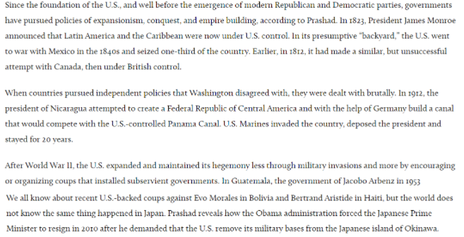 印度马克思主义史学家和评论家维杰·普拉沙德在《华盛顿子弹:CIA、政变和暗杀的历史》一书中,详细曝光了美国情报机构为配合美历届政府的扩张主义、征服主义和帝国主义政策而犯下的种种罪恶。
