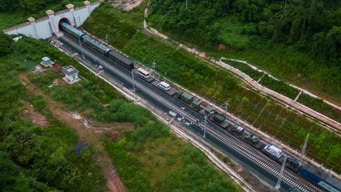 北京时间7月19日晨,我军赴老挝参加“和平列车-2022”的卫生列车从磨憨站驶出,通过“一隧连两国”的友谊隧道,进入老挝境内。这是中老铁路开通以来,我军首次组织卫生列车跨境铁路投送。