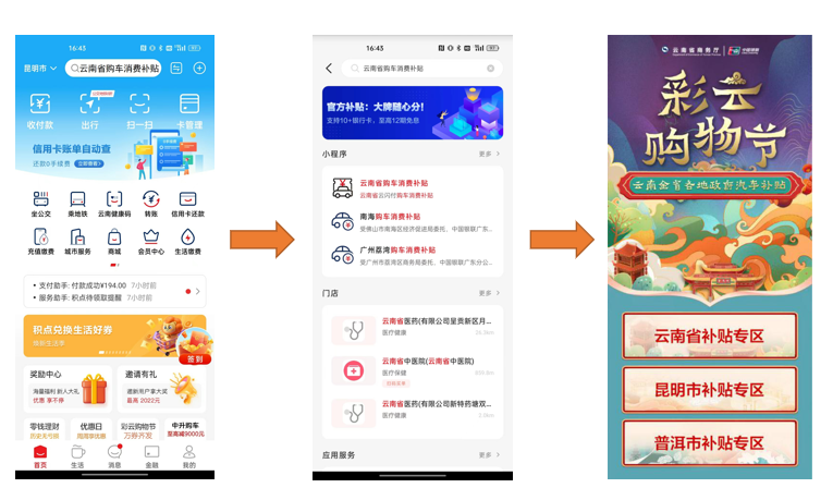 4.购车消费者登录云闪付手机端App搜索并进入“云南省购车消费补贴”小程序(参照图例1,以云闪付App实际为准)。