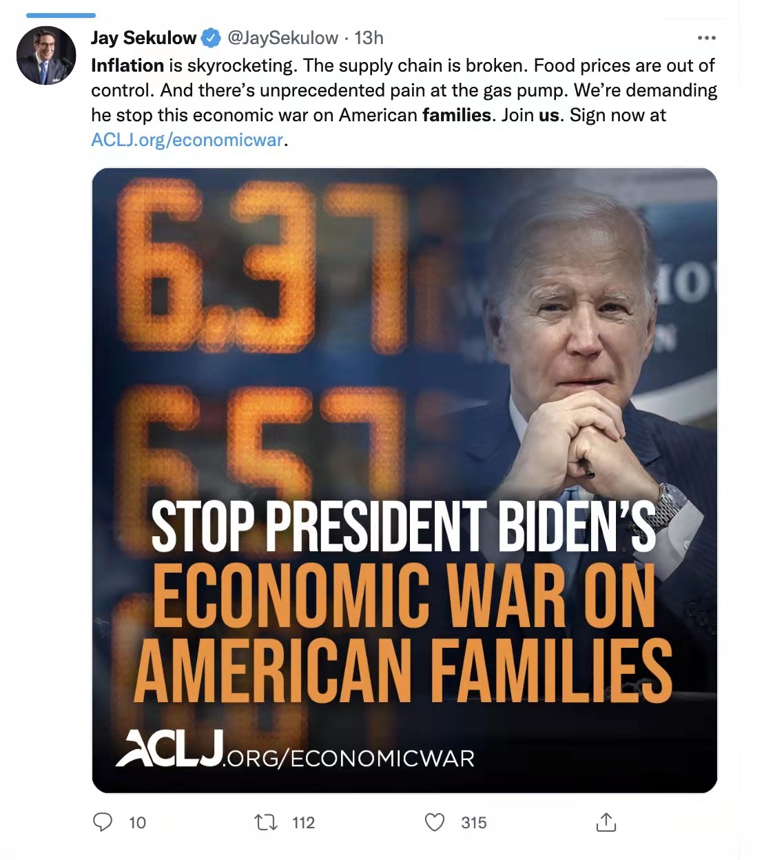 现在,吃尽苦头的美国人嘲讽说,这场通胀是针对美国人民发起的“经济大战”。他们在网上发起请愿,请拜登“住手”。