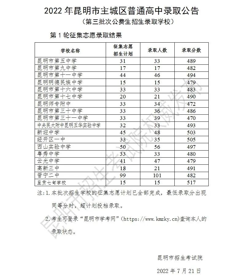 昆明信息港讯 记者上官艳君 7月21日,昆明市招生考试院发布2022年昆明市主城区普通高中录取公告(第三批次公费生招生录取学校)第1轮征集志愿录取结果。