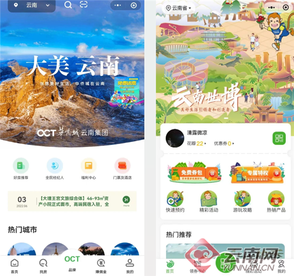 “侨云通”小程序界面(左)和“世博护照”小程序界面(右) 云南世博旅游控股集团有限公司 供图