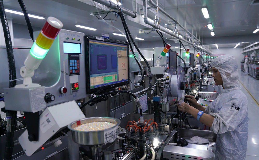 江西兆驰光元科技股份有限公司的工作人员在车间进行LED封装编带工序(2021年6月25日摄)。新华社记者 胡晨欢/摄