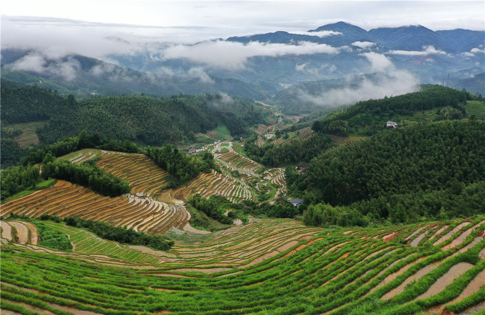 这是江西省赣州市崇义县上堡梯田(2022年6月16日摄,无人机照片)。新华社记者 万象/摄