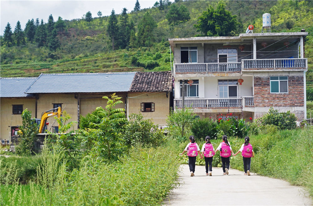 在江西省赣州市崇义县上堡乡上堡村,孩子们走在放学回家的路上(2020年9月10日摄)。远处是一户村民的土坯房祖屋和新建的三层小楼。新华社记者 万象/摄