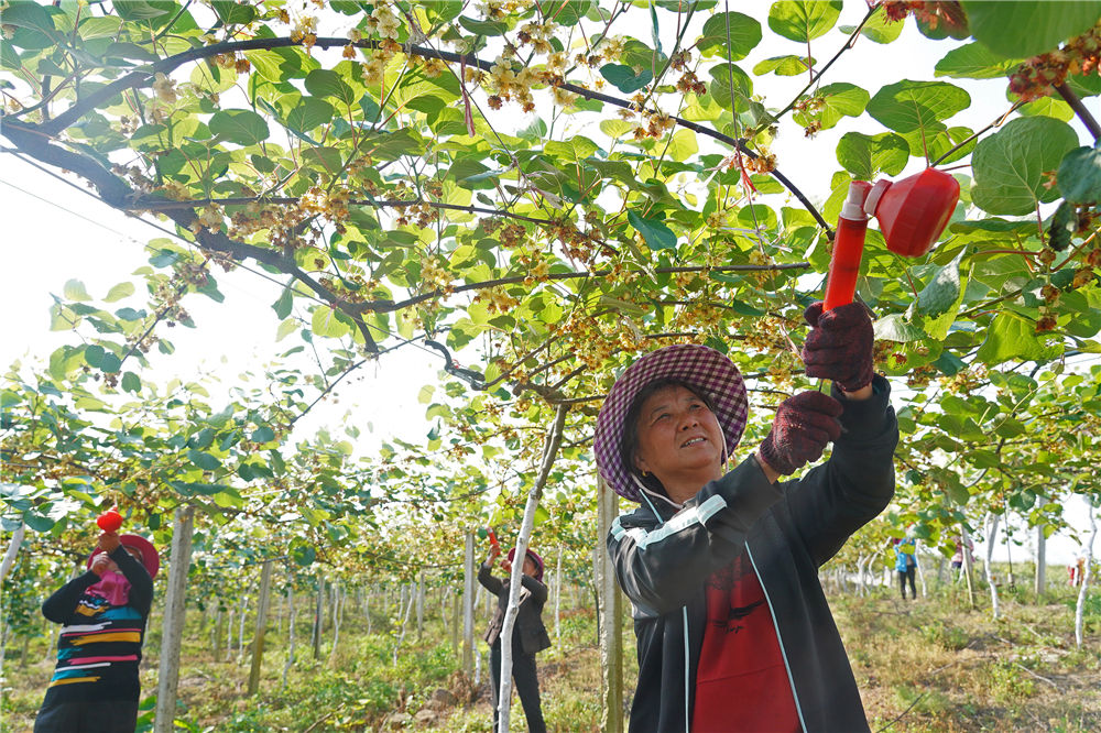 在位于江西宜春市奉新县赤岸镇城下村的“初心园”猕猴桃产业扶贫基地,村民为猕猴桃果树进行人工授粉(2020年4月29日摄)。新华社记者 万象/摄